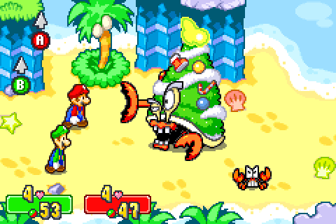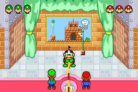 On your travels to the Beanbean Kingdom you come across a jumping game against the Sledge Bros. The background of the gatehouse shows an 8-bit style flagpole and castle scene from Super Mario Bros.
