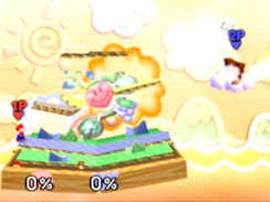 A collection of floating platforms above Peach's castle. The stage is based on various areas from Super Mario 64, including sliding platforms, a tower from Peach's castle, a chequered floor and broken bridges.