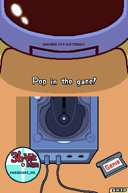 The brief minigame during the intro involves dropping a GameCube game "36-Volt Man" into the system. There is also a Game Boy Advance cart on the floor.