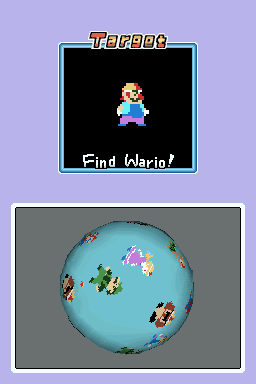 In Warioman's "Where's Wario" microgame, you have to spin a 3D ball to find the picture of Wario. On the hardest difficulty you will have to search through a bunch of pixellated characters to find the 8-bit style Wario sprite based on the arcade Mario Bros. Other characters include Luigi, Goombas and Koopa Troopas from the Mario series, all wearing Wario's yellow headgear.