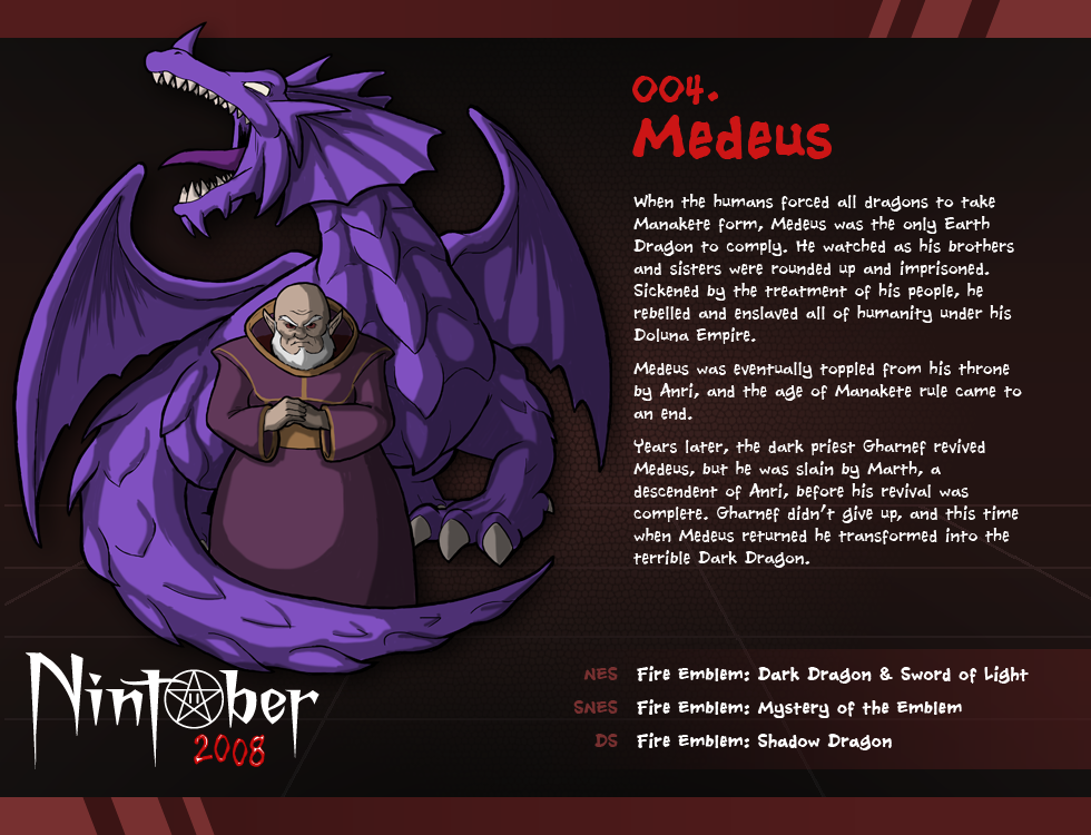 When the humans forced all dragons to take Manakete form, Medeus was the only Earth Dragon to comply. He watched as his brothers and sisters were rounded up and imprisoned. Sickened by the treatment of his people, he rebelled and enslaved all of humanity under his Doluna Empire.