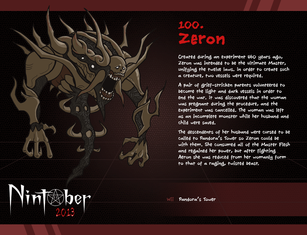 The descendents of her husband were cursed to be called to Pandora's Tower so Zero could be with them. She consumed all of the Master Flesh and regained her power, but after fighting Aeron she was reduced from her womanly form to that of a raging, twisted beast.