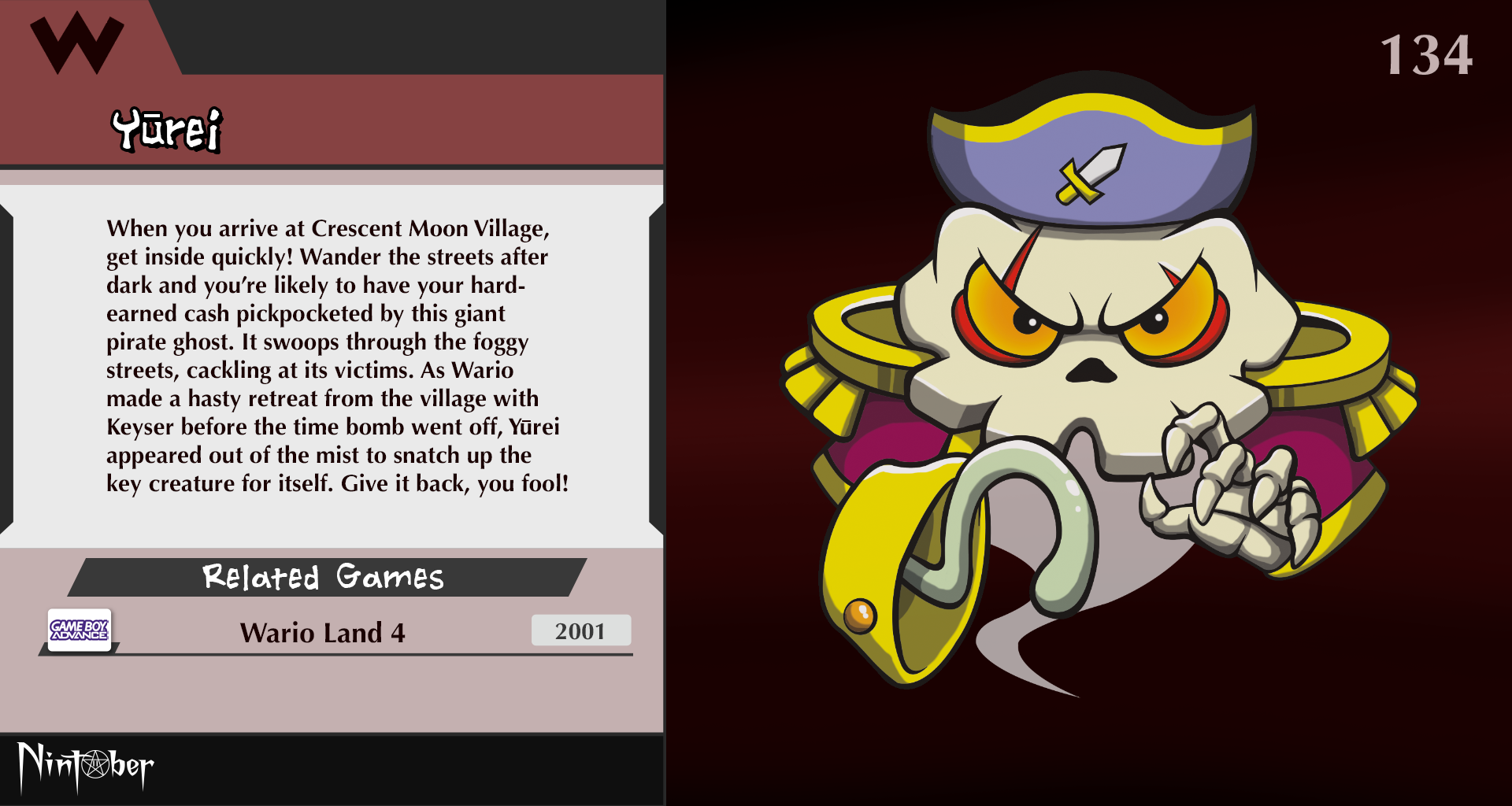 When you arrive at Crescent Moon Village, get inside quickly! Wander the streets after dark and you're likely to have your hard-earned cash pickpocketed by this giant pirate ghost. It swoops through the foggy streets, cackling at its victims. As Wario made a hasty retreat from the village with Keyser before the time bomb went off, Yūrei appeared out of the mist to snatch up the key creature for itself. Give it back, you fool!
