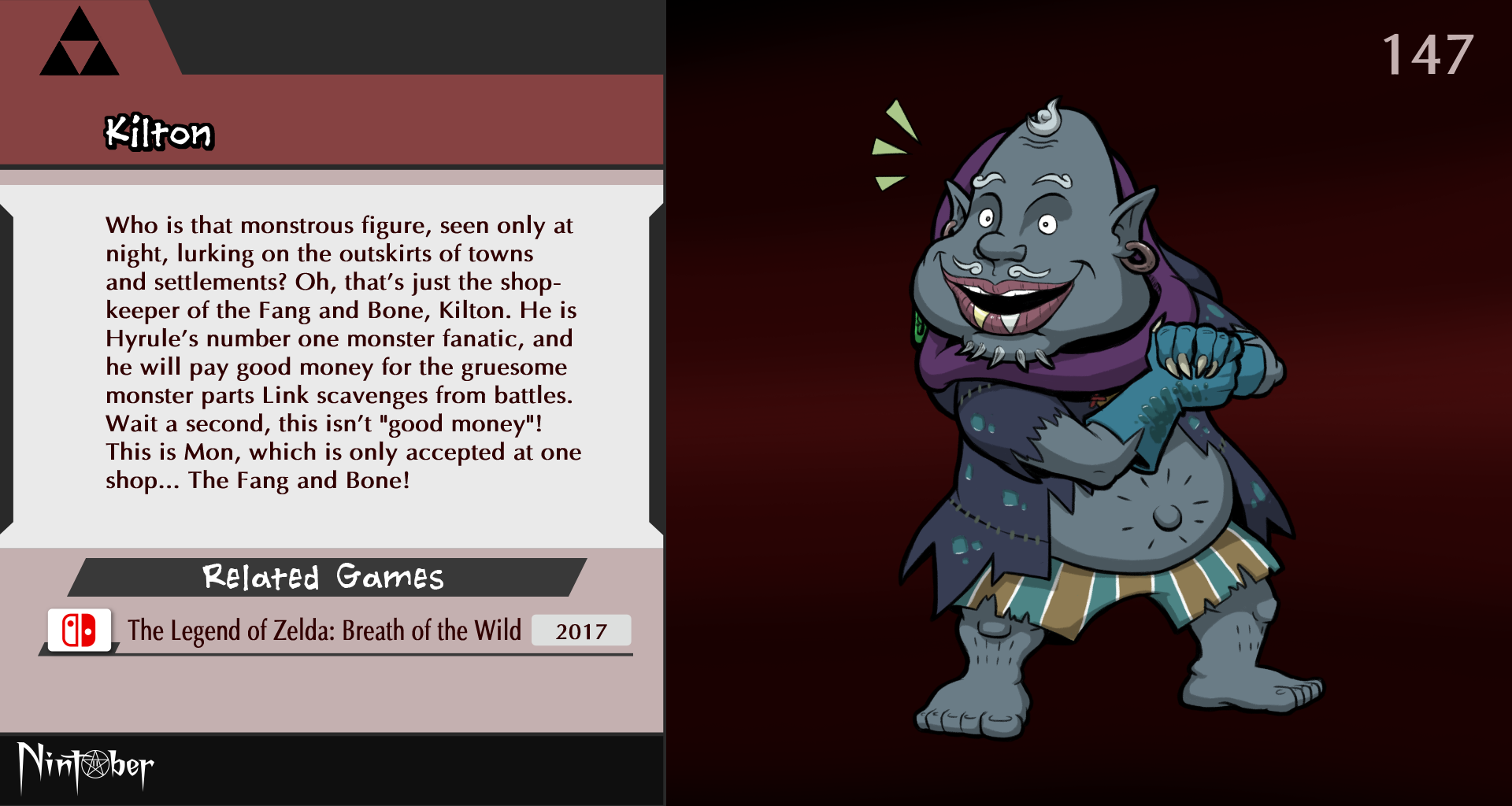 Who is that monstous figure, seen only at night, lurking on the outskirts of towns and settlements? Oh, that's just the shopkeeper of the Fang and Bone, Kilton. He is Hyrule's number one monster fanatic, and he will pay good money for the gruesome monster parts Link scavenges from battles. Wait a second, this isn't "good money"! This is Mon, which is only accepted at one shop… The Fang and Bone!